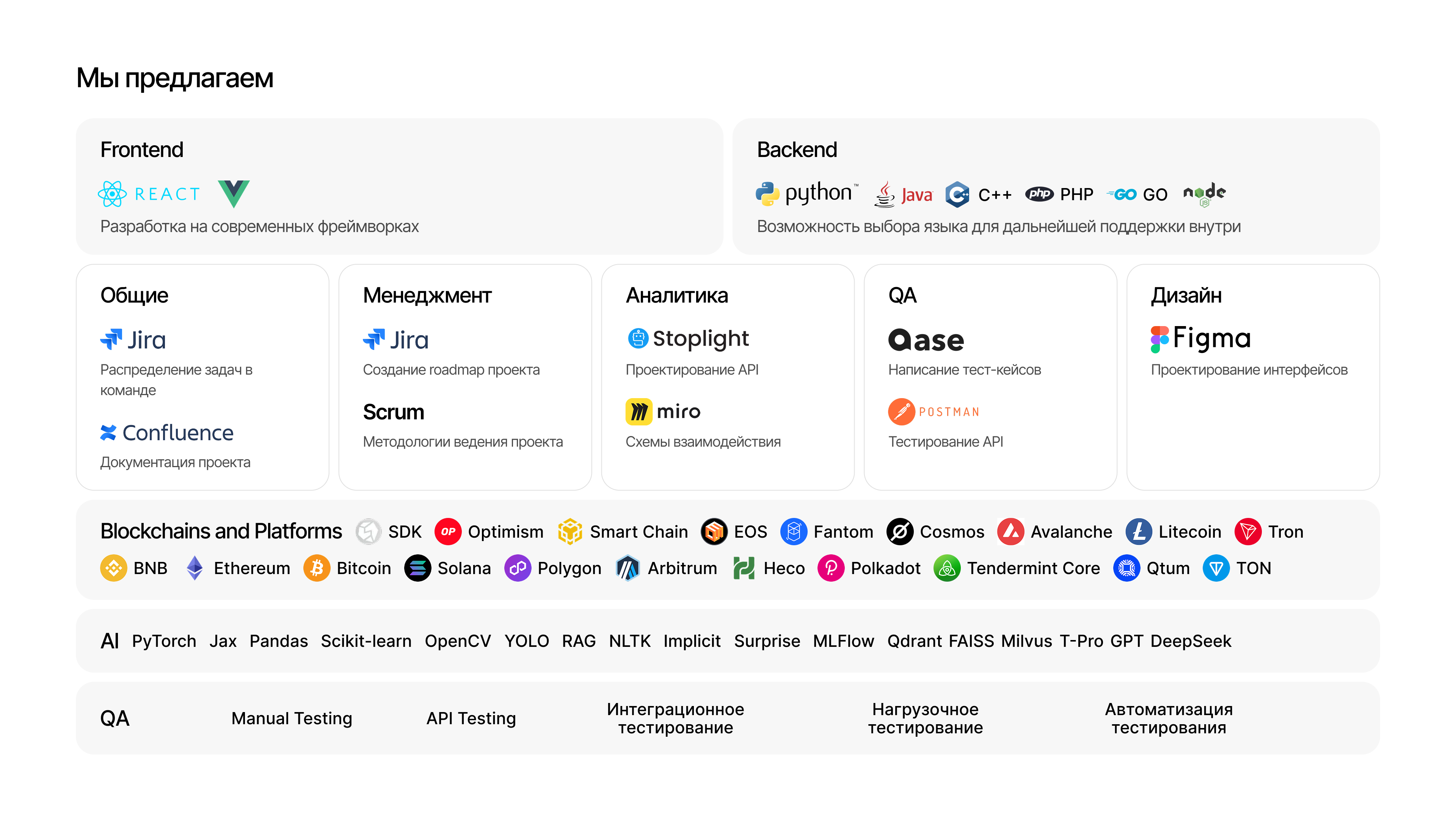 Стоимость работ (услуг) рассчитывается исходя из затрат часов технических специалистов, которые требуются для реализации проекта на стадиях: проектирования, разработки, тестирования, разворачивания, внедрения, обучения и мониторинга, а также технической и интеграционной сложности проекта.